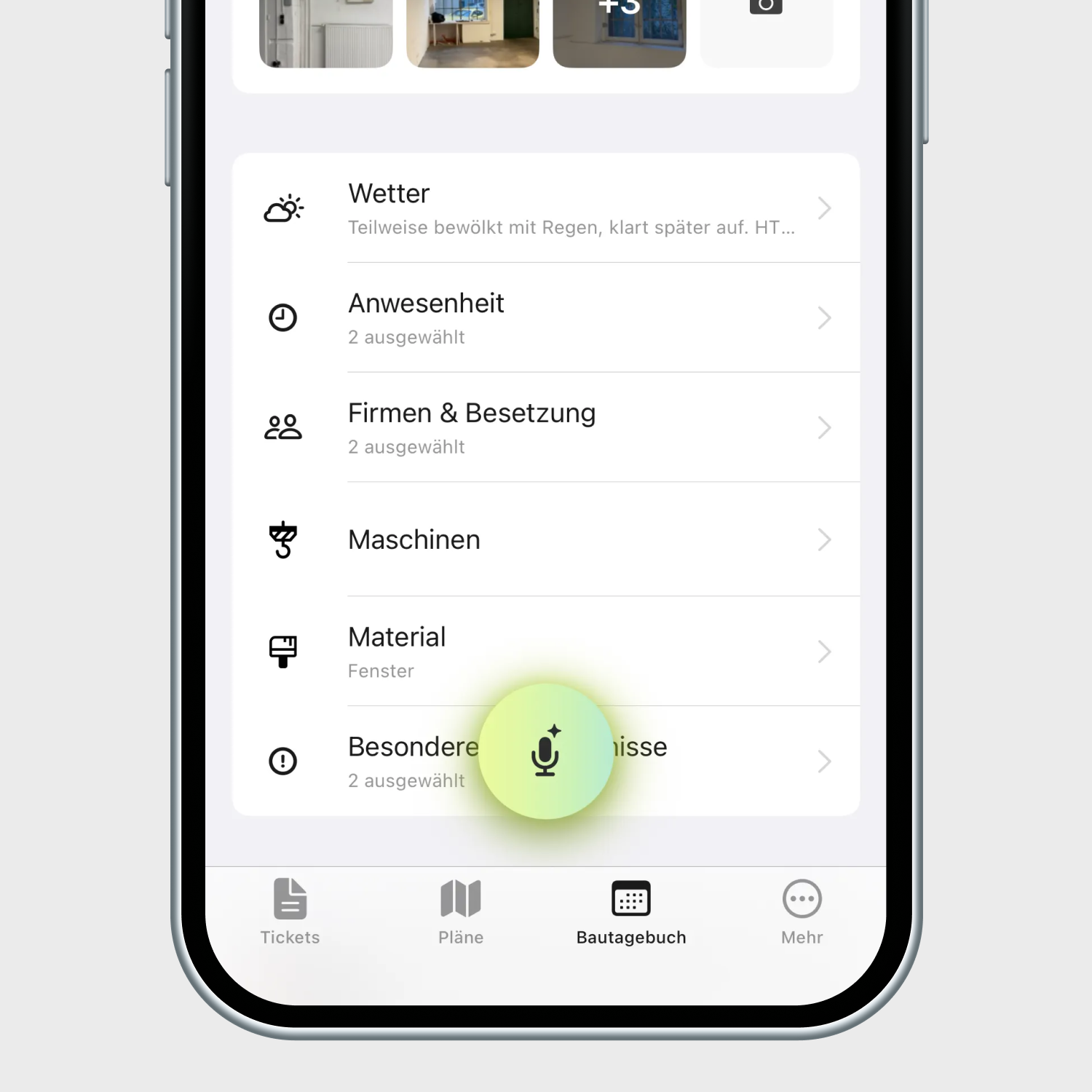 Tagesgeschehen per Sprache oder Foto erfassen und als strukturiertes Bautagebuch abschließen.