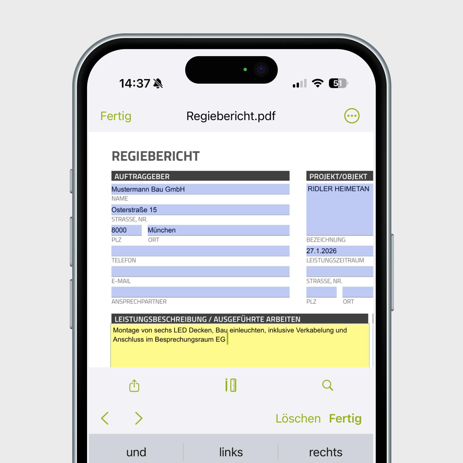 Zusatzleistungen direkt vor Ort dokumentieren und als Regiebericht ausgeben.