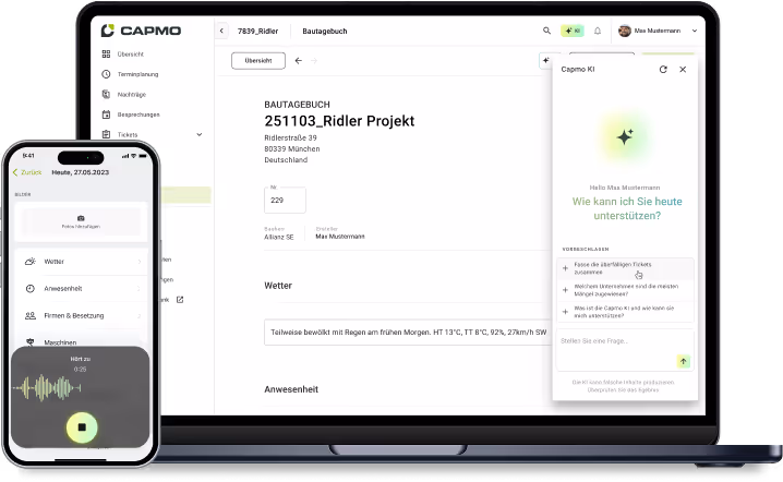 Firmen, Leistungen und Vorkommnisse per Spracheingabe oder Foto auf der Baustelle erfassen - Capmo strukturiert die Inhalte und unterstützt dabei, alles vollständig zu dokumentieren.